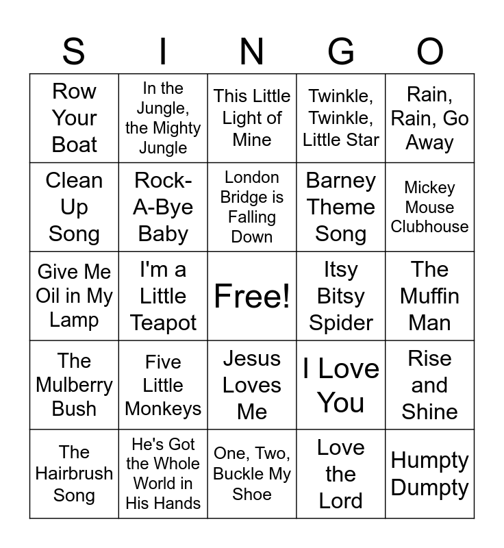 This bingo card has a free space and 39 words: Old MacDonald Had A Farm, Wheels on the Bus, Hickory Dickory Dock, Rock-A-Bye Baby, The Hairbrush Song, Jesus Loves Me, London Bridge is Falling Down, Mary Had A Little Lamb, Rain, Rain, Go Away, The Mulberry Bush, I'm a Little Teapot, Twinkle, Twinkle, Little Star, Humpty Dumpty, The Muffin Man, Itsy Bitsy Spider, Five Little Monkeys, Frere Jacques, Row Your Boat, His Cheese-Burger, I Love You, Clean Up Song, One, Two, Buckle My Shoe, Barney Theme Song, Mickey Mouse Clubhouse, John Jacob Jingleheimer Schmidt, Fruit Salad, Rattlin' Bog, Hot Potato, Color My Life With Love, In the Jungle, the Mighty Jungle, Blue's Clues, B-I-N-G-O, This Little Light of Mine, He's Got the Whole World in His Hands, Love the Lord, Father Abraham, Rise and Shine, Give Me Oil in My Lamp and Baa, Baa, Black Sheep.