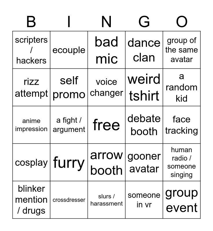 This bingo card has a free space and 24 words: furry, crossdresser, voice changer, blinker mention / drugs, group of the same avatar, scripters / hackers, rizz attempt, ecouple, debate booth, arrow booth, weird tshirt, anime impression, gooner avatar, human radio / someone singing, self promo, someone in vr, face tracking, bad mic, a random kid, a fight / argument, group event, cosplay, dance clan and slurs / harassment.