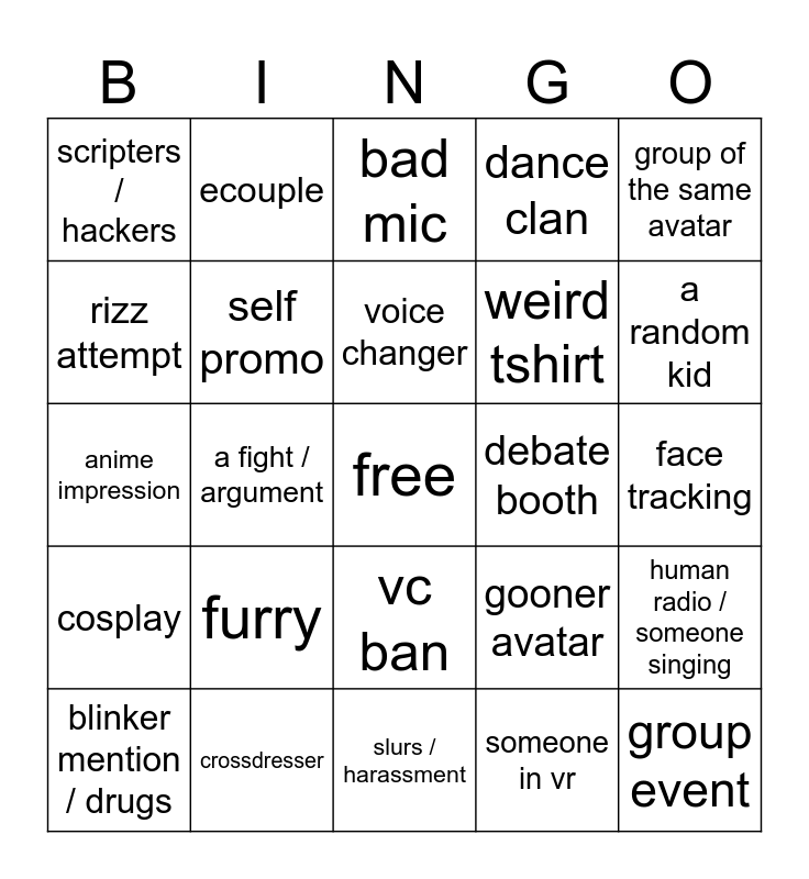 This bingo card has a free space and 24 words: furry, crossdresser, voice changer, blinker mention / drugs, group of the same avatar, scripters / hackers, rizz attempt, ecouple, debate booth, vc ban, weird tshirt, anime impression, gooner avatar, human radio / someone singing, self promo, someone in vr, face tracking, bad mic, a random kid, a fight / argument, group event, cosplay, dance clan and slurs / harassment.
