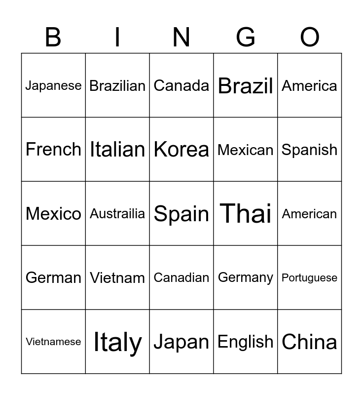 This bingo card has a free space and 29 words: Vietnamese, Thailand, Austrailia, Chinese, Japanese, Canada, Italian, Vietnam, Thai, Italy, American, China, Japan, English, Spanish, Austrailian, Canadian, German, America, Mexico, Germany, France, Mexican, French, Brazil, Brazilian, Portuguese, Korea and Korean.