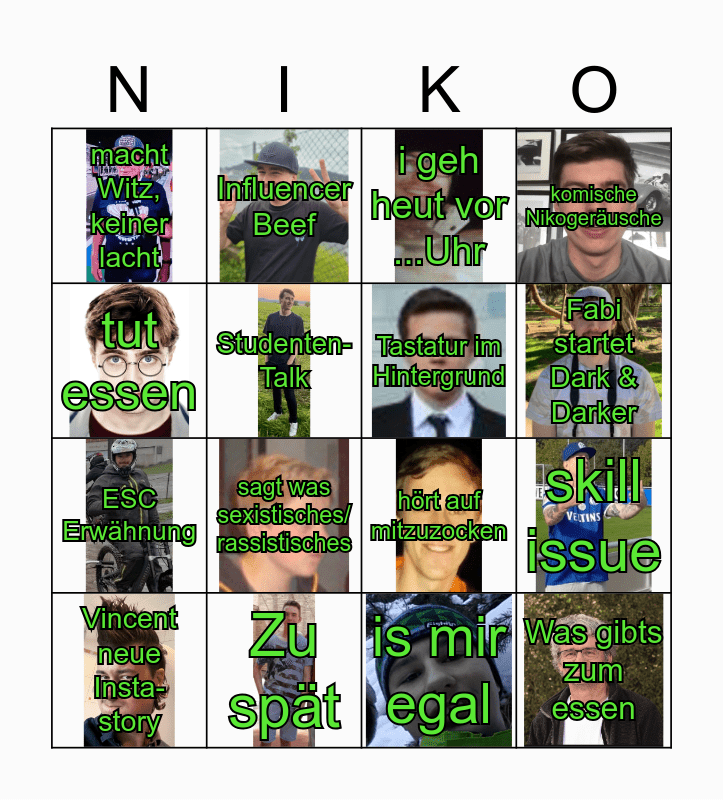 This bingo card has 16 images and 16 words: Zu spät, skill issue, i geh heut vor ...Uhr, macht Witz, keiner lacht, ESC Erwähnung, Influencer Beef, hört auf mitzuzocken, is mir egal, tut essen, Studenten-Talk, Vincent neue Insta-story, komische Nikogeräusche, sagt was sexistisches/ rassistisches, Fabi startet Dark & Darker, Tastatur im Hintergrund and Was gibts zum essen.