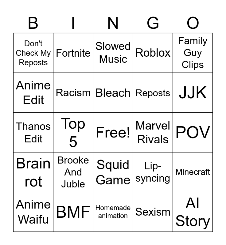 This bingo card has a free space and 24 words: Brooke And Juble, BMF, Bleach, Anime Waifu, Family Guy Clips, Don't Check My Reposts, Anime Edit, Fortnite, Marvel Rivals, Squid Game, Reposts, Thanos Edit, Lip-syncing, Minecraft, Racism, Sexism, POV, Slowed Music, JJK, Top 5, AI Story, Brain rot, Roblox and Homemade animation.