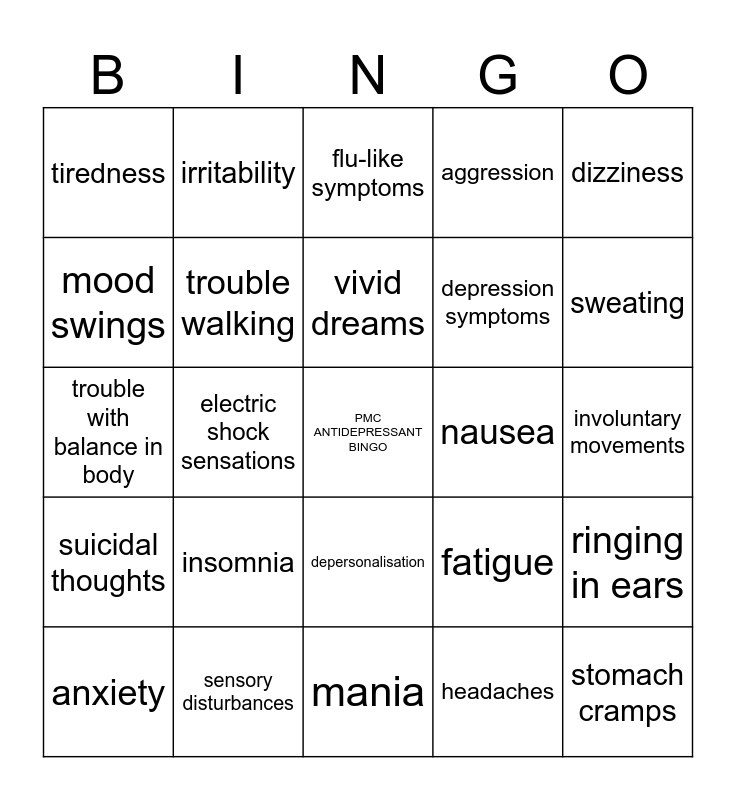 This bingo card has a free space and 24 words: anxiety, insomnia, vivid dreams, headaches, dizziness, tiredness, irritability, flu-like symptoms, nausea, involuntary movements, trouble with balance in body, trouble walking, fatigue, ringing in ears, mood swings, sensory disturbances, mania, aggression, sweating, suicidal thoughts, electric shock sensations, depersonalisation, depression symptoms and stomach cramps.