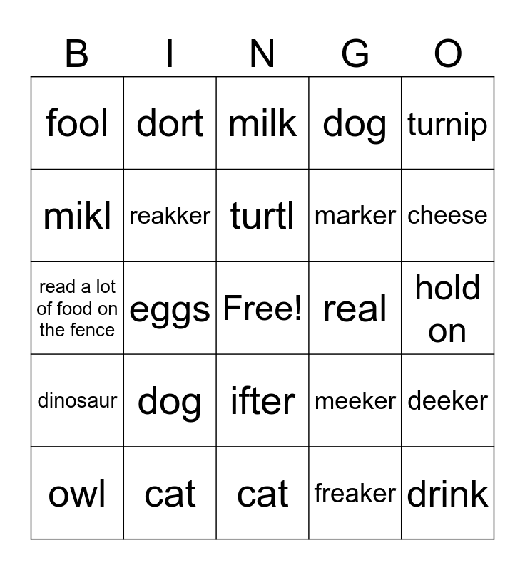 This bingo card has a free space and 24 words: dog, cat, turtl, owl, turnip, fool, mikl, dort, real, ifter, marker, read a lot of food on the fence, meeker, deeker, reakker, freaker, hold on, milk, cheese, eggs, drink, dinosaur, dog and cat.