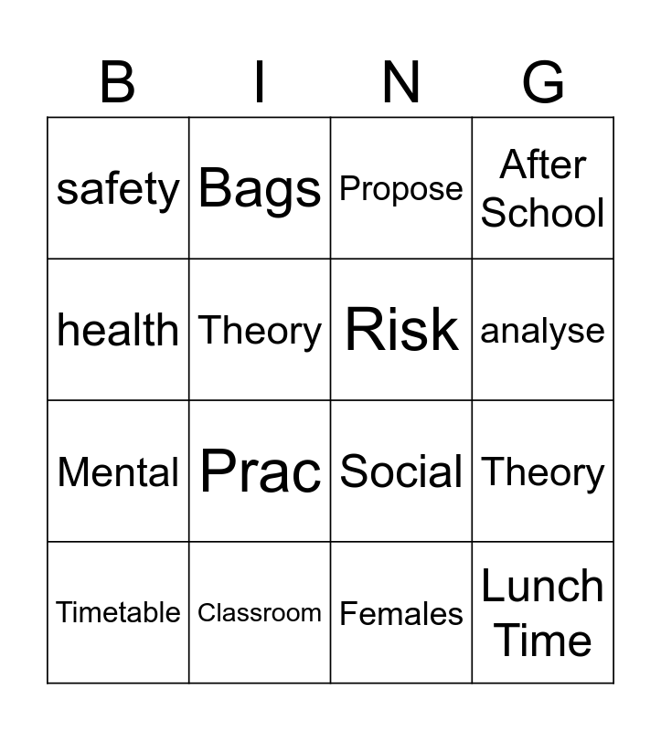 This bingo card has 24 words: Free!, Lesson Goal, analyse, wellbeing, health, safety, Theory, Bags, Classroom, Dimensions of Health, Mental, Social, Emotional, Strategies, Risk, Males, Females, Propose, Prac, Theory, Timetable, Lunch Time, After School and Uniform.