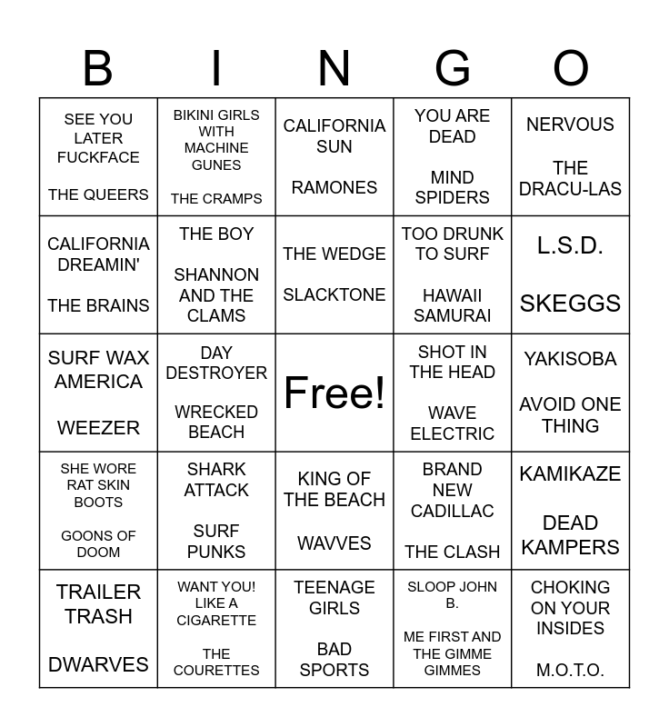This bingo card has a free space and 24 words: SHARK ATTACK SURF PUNKS, WANT YOU! LIKE A CIGARETTE THE COURETTES, THE WEDGE SLACKTONE, TRAILER TRASH DWARVES, NERVOUS THE DRACU-LAS, SEE YOU LATER FUCKFACE THE QUEERS, CALIFORNIA DREAMIN' THE BRAINS, BIKINI GIRLS WITH MACHINE GUNES THE CRAMPS, SHOT IN THE HEAD WAVE ELECTRIC, KING OF THE BEACH WAVVES, TOO DRUNK TO SURF HAWAII SAMURAI, SURF WAX AMERICA WEEZER, BRAND NEW CADILLAC THE CLASH, KAMIKAZE DEAD KAMPERS, THE BOY SHANNON AND THE CLAMS, SLOOP JOHN B. ME FIRST AND THE GIMME GIMMES, YAKISOBA AVOID ONE THING, CALIFORNIA SUN RAMONES, L.S.D. SKEGGS, DAY DESTROYER WRECKED BEACH, CHOKING ON YOUR INSIDES M.O.T.O., SHE WORE RAT SKIN BOOTS GOONS OF DOOM, YOU ARE DEAD MIND SPIDERS and TEENAGE GIRLS BAD SPORTS.