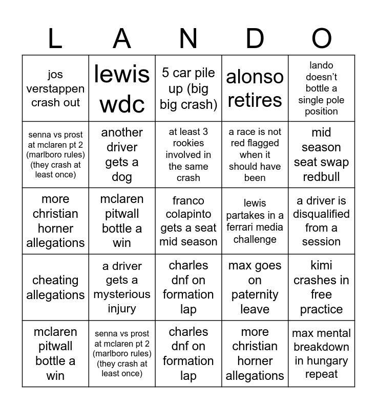 This bingo card has 50 words: mid season seat swap redbull, franco colapinto gets a seat mid season, 5 car pile up (big big crash), charles dnf on formation lap, a driver gets a mysterious injury, george dnfs last or second to last lap of a race, lewis wdc, mclaren wcc, senna vs prost at mclaren pt 2 (marlboro rules) (they crash at least once), valtteri stands in for a race, another driver gets a dog, alonso retires, kimi crashes in free practice, max goes on paternity leave, kimi crashes in free practice, a driver is disqualified from a session, at least 3 rookies involved in the same crash, lewis partakes in a ferrari media challenge, lando wdc, lando doesn’t bottle a single pole position, mclaren pitwall bottle a win, more christian horner allegations, jos verstappen crash out, a race is not red flagged when it should have been, cheating allegations, max mental breakdown in hungary repeat, mid season seat swap redbull, franco colapinto gets a seat mid season, 5 car pile up (big big crash), charles dnf on formation lap, a driver gets a mysterious injury, george dnfs last or second to last lap of a race, lewis wdc, mclaren wcc, senna vs prost at mclaren pt 2 (marlboro rules) (they crash at least once), valtteri stands in for a race, another driver gets a dog, alonso retires, max goes on paternity leave, a driver is disqualified from a session, at least 3 rookies involved in the same crash, lewis partakes in a ferrari media challenge, lando wdc, lando doesn’t bottle a single pole position, mclaren pitwall bottle a win, more christian horner allegations, jos verstappen crash out, a race is not red flagged when it should have been, cheating allegations and max mental breakdown in hungary repeat.