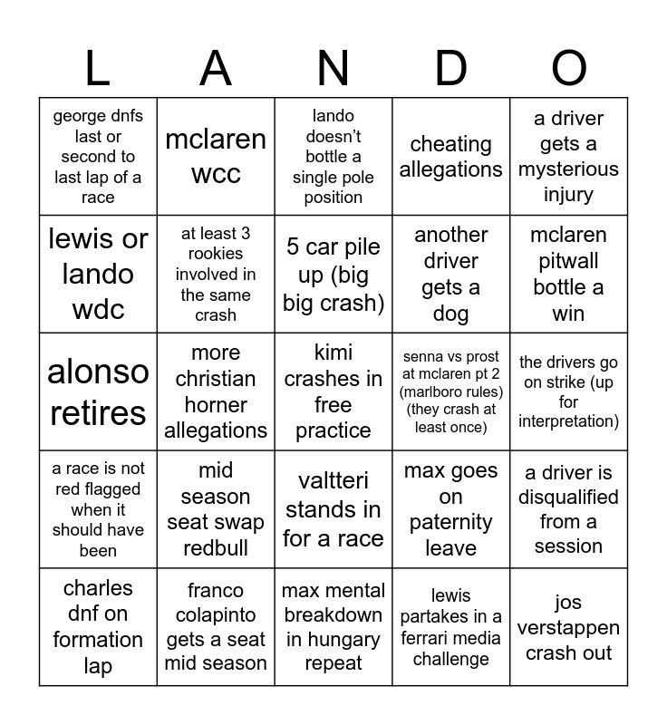 This bingo card has a free space and 24 words: mid season seat swap redbull, franco colapinto gets a seat mid season, 5 car pile up (big big crash), charles dnf on formation lap, a driver gets a mysterious injury, george dnfs last or second to last lap of a race, lewis or lando wdc, mclaren wcc, senna vs prost at mclaren pt 2 (marlboro rules) (they crash at least once), valtteri stands in for a race, another driver gets a dog, alonso retires, max goes on paternity leave, a driver is disqualified from a session, at least 3 rookies involved in the same crash, lewis partakes in a ferrari media challenge, the drivers go on strike (up for interpretation), lando doesn’t bottle a single pole position, mclaren pitwall bottle a win, more christian horner allegations, jos verstappen crash out, a race is not red flagged when it should have been, cheating allegations and max mental breakdown in hungary repeat.