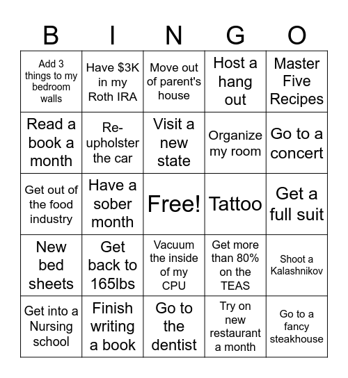 This bingo card has a free space and 24 words: Get back to 165lbs, Finish writing a book, Visit a new state, Get into a Nursing school, Master Five Recipes, Add 3 things to my bedroom walls, Read a book a month, Have $3K in my Roth IRA, Tattoo, Vacuum the inside of my CPU, Organize my room, Get out of the food industry, Get more than 80% on the TEAS, Shoot a Kalashnikov, Re-upholster the car, Try on new restaurant a month, Get a full suit, Move out of parent's house, Go to a concert, Have a sober month, Go to a fancy steakhouse, New bed sheets, Host a hang out and Go to the dentist.