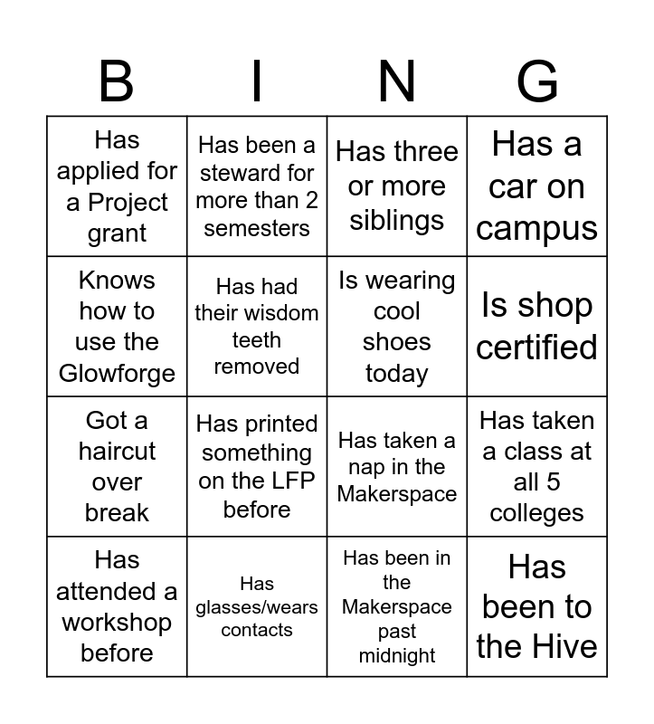 This bingo card has 16 words: Has glasses/wears contacts, Has taken a class at all 5 colleges, Has three or more siblings, Has applied for a Project grant, Got a haircut over break, Has been a steward for more than 2 semesters, Has taken a nap in the Makerspace, Has been in the Makerspace past midnight, Knows how to use the Glowforge, Has had their wisdom teeth removed, Has attended a workshop before, Has a car on campus, Has printed something on the LFP before, Is shop certified, Is wearing cool shoes today and Has been to the Hive.