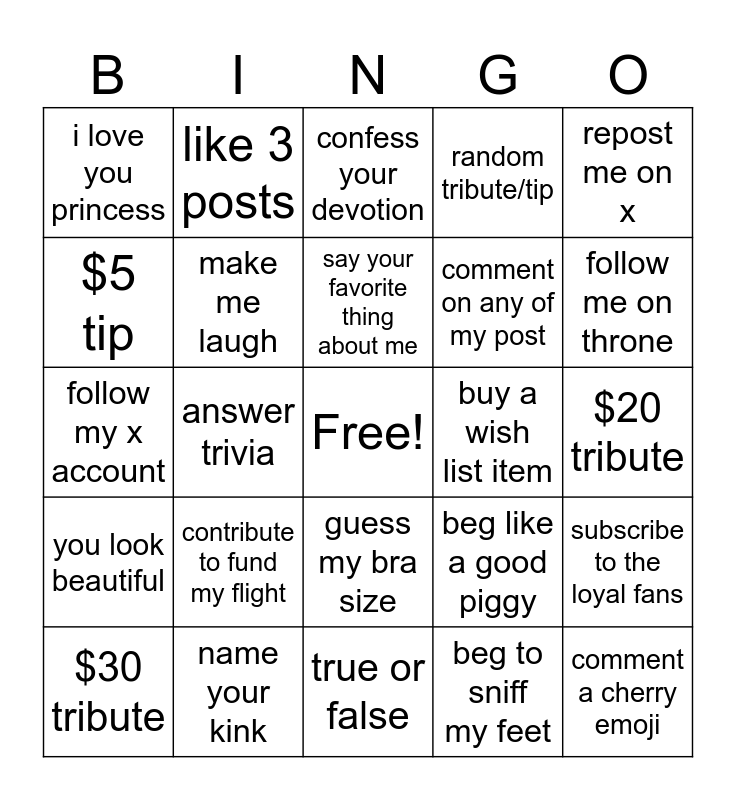 This bingo card has a free space and 24 words: contribute to fund my flight, name your kink, say your favorite thing about me, $30 tribute, repost me on x, i love you princess, $5 tip, like 3 posts, buy a wish list item, guess my bra size, comment on any of my post, follow my x account, beg like a good piggy, subscribe to the loyal fans, make me laugh, beg to sniff my feet, $20 tribute, confess your devotion, follow me on throne, answer trivia, comment a cherry emoji, you look beautiful, random tribute/tip and true or false.