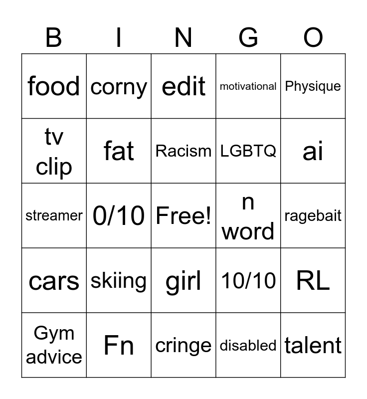 This bingo card has a free space and 24 words: skiing, Fn, Racism, Gym advice, Physique, food, tv clip, corny, n word, girl, LGBTQ, streamer, 10/10, RL, fat, disabled, ragebait, edit, ai, 0/10, talent, cars, motivational and cringe.