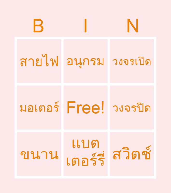 This bingo card has a free space and 8 words: วงจรปิด, วงจรเปิด, อนุกรม, ขนาน, สายไฟ, สวิตช์, มอเตอร์ and แบตเตอร์รี่.