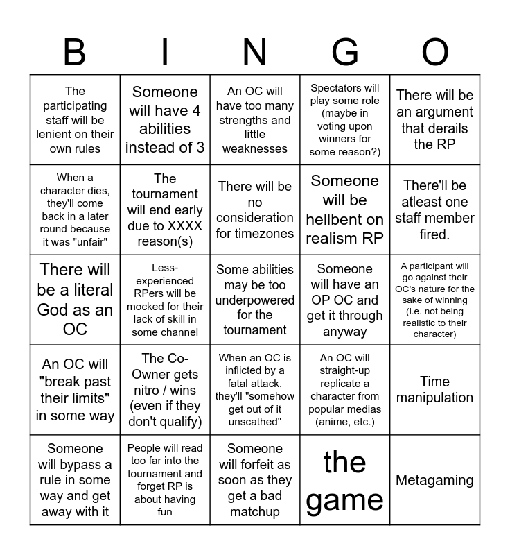 This bingo card has 25 words: The Co-Owner gets nitro / wins (even if they don't qualify), Someone will forfeit as soon as they get a bad matchup, There will be no consideration for timezones, Someone will bypass a rule in some way and get away with it, There will be an argument that derails the RP, The participating staff will be lenient on their own rules, When a character dies, they'll come back in a later round because it was "unfair", Someone will have 4 abilities instead of 3, Someone will have an OP OC and get it through anyway, When an OC is inflicted by a fatal attack, they'll "somehow get out of it unscathed", Someone will be hellbent on realism RP, There will be a literal God as an OC, An OC will straight-up replicate a character from popular medias (anime, etc.), Time manipulation, The tournament will end early due to XXXX reason(s), Metagaming, A participant will go against their OC's nature for the sake of winning (i.e. not being realistic to their character), An OC will have too many strengths and little weaknesses, There'll be atleast one staff member fired., Less-experienced RPers will be mocked for their lack of skill in some channel, Some abilities may be too underpowered for the tournament, People will read too far into the tournament and forget RP is about having fun, An OC will "break past their limits" in some way, Spectators will play some role (maybe in voting upon winners for some reason?) and the game.