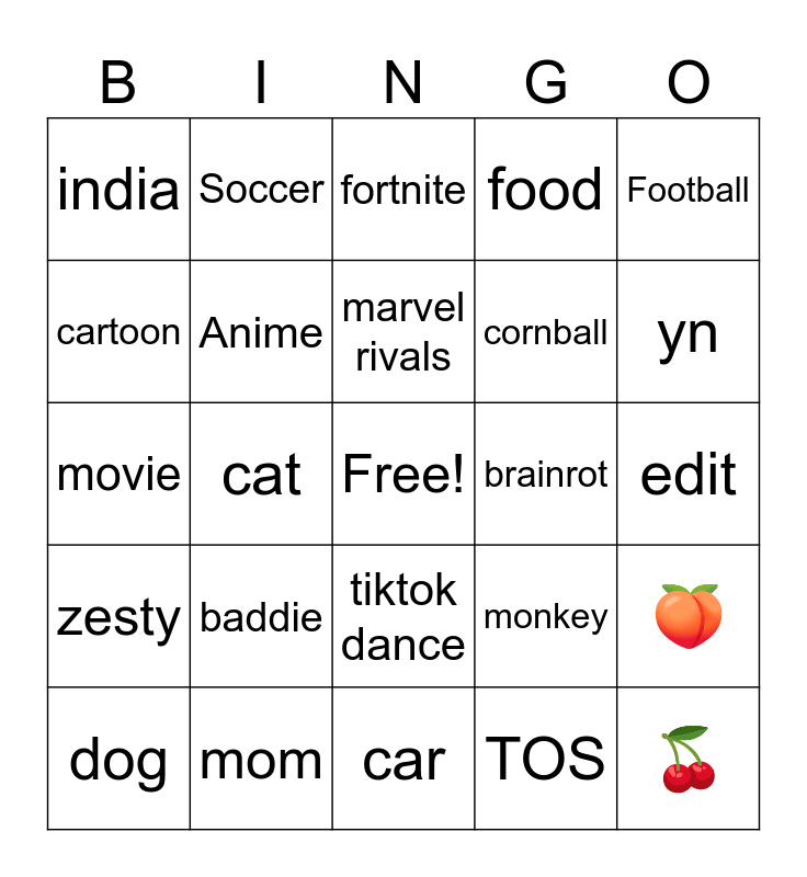 This bingo card has a free space and 24 words: baddie, mom, marvel rivals, dog, Football, india, cartoon, Soccer, brainrot, tiktok dance, cornball, movie, monkey, 🍑, Anime, TOS, edit, fortnite, yn, cat, 🍒, zesty, food and car.