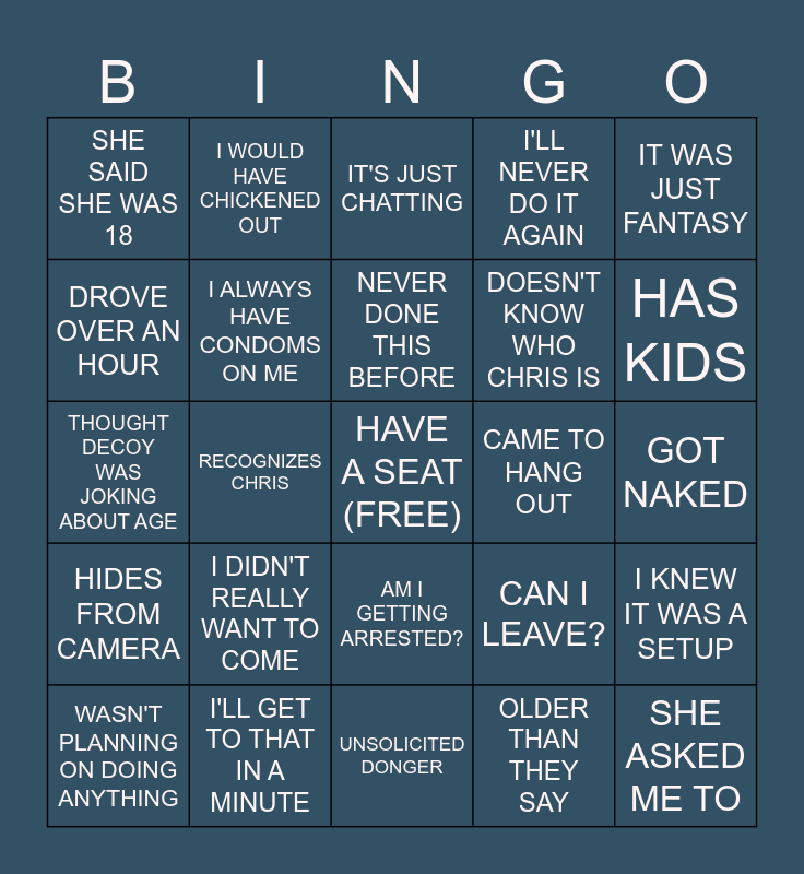 This bingo card has a free space and 24 words: WASN'T PLANNING ON DOING ANYTHING, I DIDN'T REALLY WANT TO COME, NEVER DONE THIS BEFORE, OLDER THAN THEY SAY, IT WAS JUST FANTASY, SHE SAID SHE WAS 18, I WOULD HAVE CHICKENED OUT, IT'S JUST CHATTING, CAME TO HANG OUT, GOT NAKED, THOUGHT DECOY WAS JOKING ABOUT AGE, I ALWAYS HAVE CONDOMS ON ME, CAN I LEAVE?, I KNEW IT WAS A SETUP, DROVE OVER AN HOUR, I'LL GET TO THAT IN A MINUTE, UNSOLICITED DONGER, I'LL NEVER DO IT AGAIN, HAS KIDS, HIDES FROM CAMERA, RECOGNIZES CHRIS, AM I GETTING ARRESTED?, DOESN'T KNOW WHO CHRIS IS and SHE ASKED ME TO.