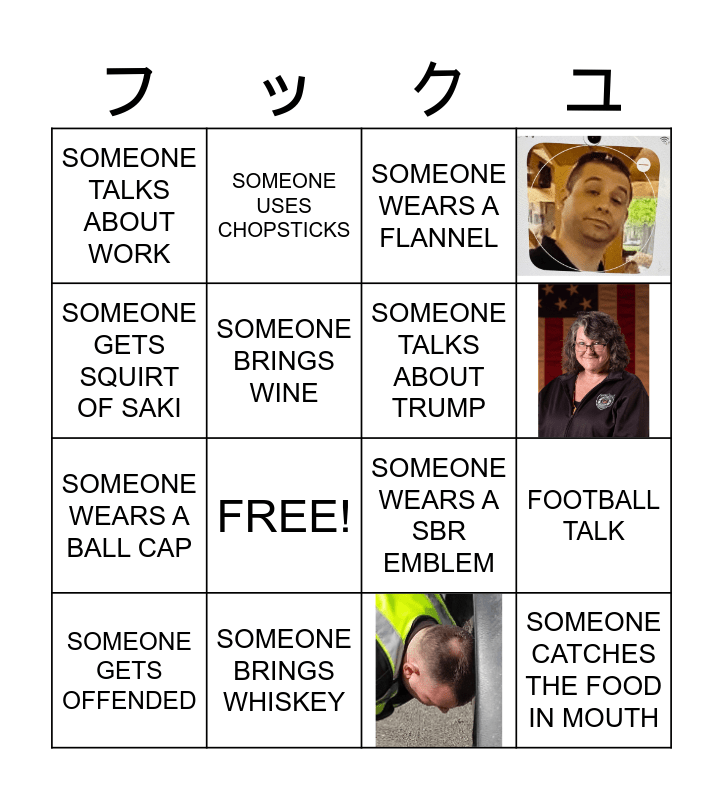 This bingo card has 4 images and 16 words: FOOTBALL TALK, SOMEONE KNOWS A PATRON, SOMEONE WEARS A FLANNEL, SOMEONE WEARS BDU's, SOMEONE GETS OFFENDED, SOMEONE GETS SQUIRT OF SAKI, SOMEONE BRINGS WHISKEY, SOMEONE TALKS ABOUT WORK, SOMEONE WEARS A BALL CAP, SOMEONE USES CHOPSTICKS, FREE!, SOMEONE WEARS A SBR EMBLEM, SOMEONE BRINGS WINE, SOMEONE CATCHES THE FOOD IN MOUTH, SOMEONE TALKS ABOUT TRUMP and SOMEONE HAS A GUN.