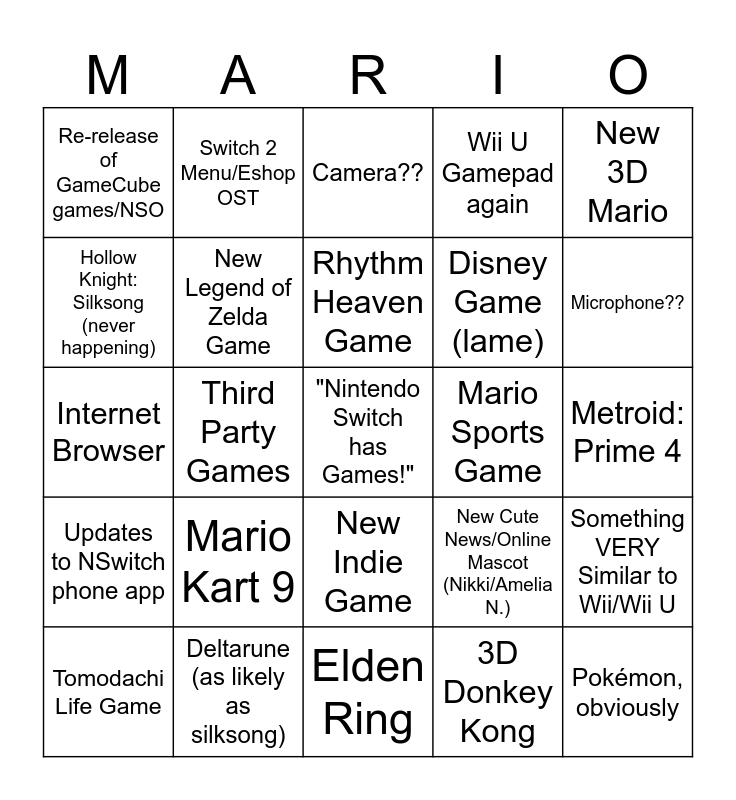 This bingo card has a free space and 25 words: Mario Kart 9, Elden Ring, Rhythm Heaven Game, Tomodachi Life Game, New 3D Mario, Re-release of GameCube games/NSO, Hollow Knight: Silksong (never happening), Switch 2 Menu/Eshop OST, Mario Sports Game, New Indie Game, Disney Game (lame), Internet Browser, New Cute News/Online Mascot (Nikki/Amelia N.), Something VERY Similar to Wii/Wii U, New Legend of Zelda Game, New 3D Kirby Game, Metroid: Prime 4, Camera??, Microphone??, Third Party Games, Pokémon, obviously, Deltarune (as likely as silksong), Updates to NSwitch phone app, Wii U Gamepad again and 3D Donkey Kong.