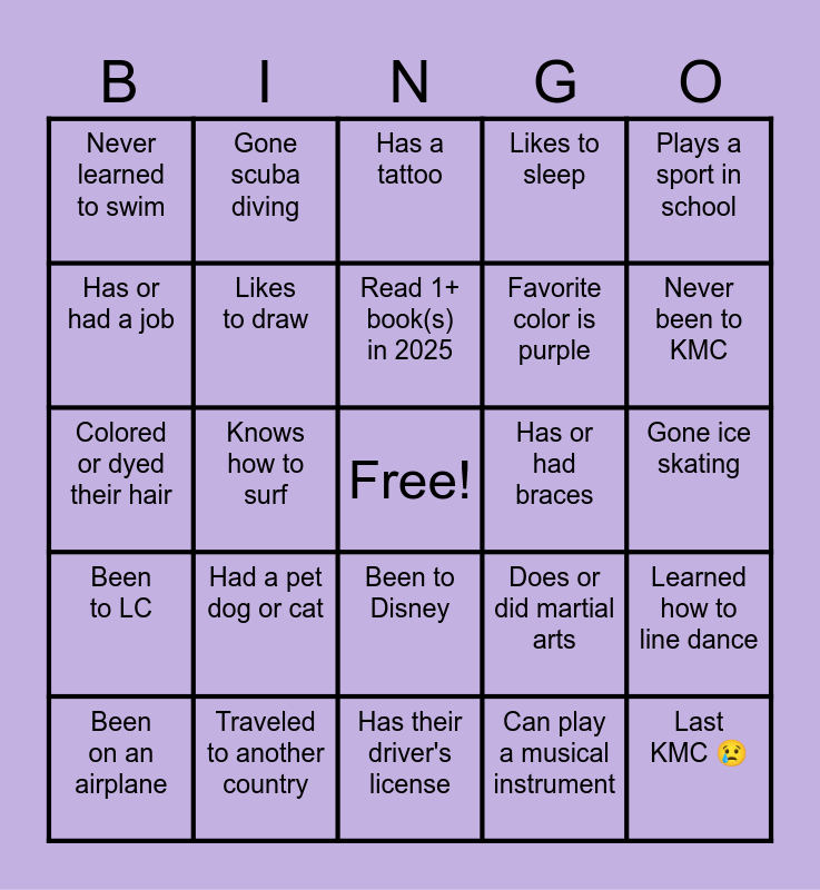 This bingo card has a free space and 24 words: Been on an airplane, Had a pet dog or cat, Read 1+ book(s) in 2025, Can play a musical instrument, Plays a sport in school, Never learned to swim, Gone scuba diving, Has a tattoo, Has or had braces, Gone ice skating, Colored or dyed their hair, Likes to draw, Does or did martial arts, Learned how to line dance, Has or had a job, Traveled to another country, Has their driver's license, Likes to sleep, Never been to KMC, Been to LC, Knows how to surf, Been to Disney, Favorite color is purple and Last KMC 😢.