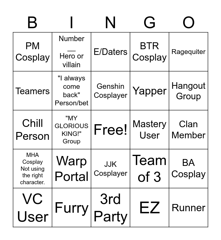 This bingo card has a free space and 24 words: Warp Portal, Furry, Genshin Cosplayer, VC User, Ragequiter, PM Cosplay, Teamers, Number __ Hero or villain, Mastery User, JJK Cosplayer, Yapper, Chill Person, Team of 3, BA Cosplay, "I always come back" Person/bet, EZ, Clan Member, E/Daters, Hangout Group, "MY GLORIOUS KING!" Group, Runner, MHA Cosplay Not using the right character., BTR Cosplay and 3rd Party.