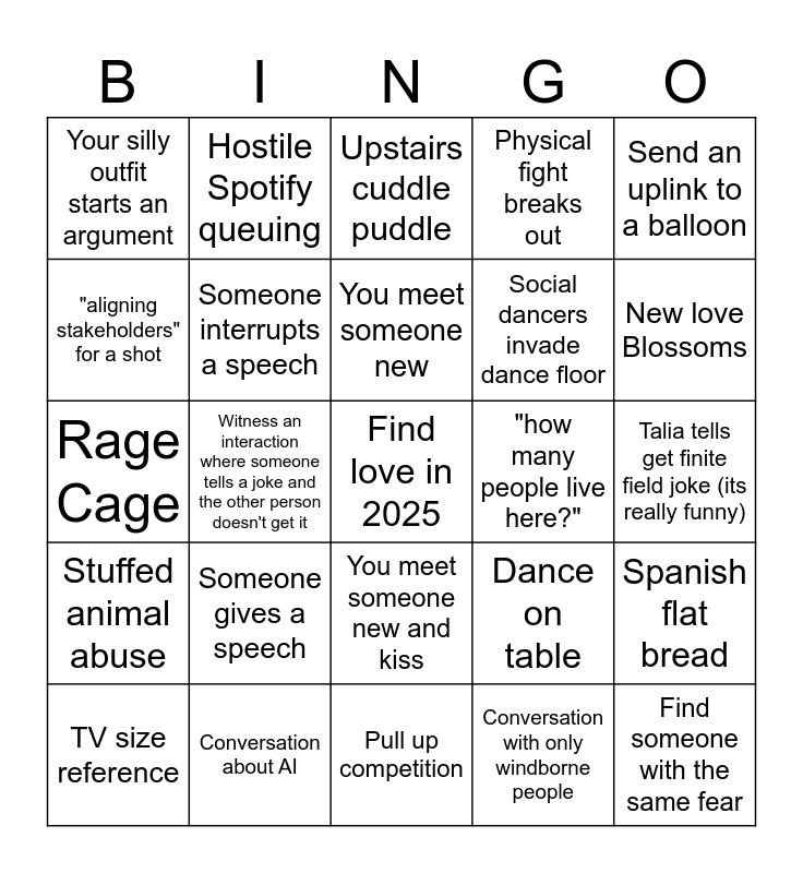 This bingo card has 28 words: Spanish flat bread, Ballon reference, Social dancers invade dance floor, Conversation with only windborne people, "aligning stakeholders" for a shot, Upstairs cuddle puddle, Hostile Spotify queuing, Stuffed animal abuse, "how many people live here?", TV size reference, Rage Cage, Physical fight breaks out, Conversation about AI, Pull up competition, New love Blossoms, Is that where noodle lives?, Someone gives a speech, Someone interrupts a speech, You meet someone new, You meet someone new and kiss, Your silly outfit starts an argument, Find someone with the same fear, Find love in 2025, Witness an interaction where someone tells a joke and the other person doesn't get it, Talia tells get finite field joke (its really funny), Dance on table, Send an uplink to a balloon and Count the morabos.
