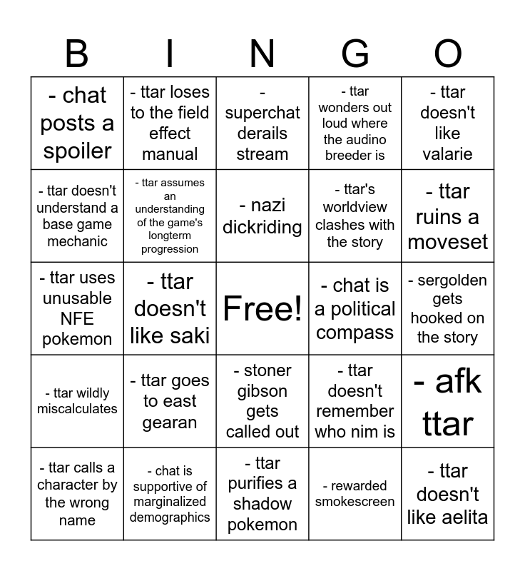 This bingo card has a free space and 42 words: - diddler joke, - nazi dickriding, - misogyny, - ttar goes to east gearan, - rewarded smokescreen, - afk ttar, - ttar doesn't like aelita, - ttar gets a renegade point, - superchat derails stream, - stoner gibson gets called out, - sergolden gets hooked on the story, - ttar ruins a moveset, - ttar doesn't like saki, - ttar doesn't like valarie, - ttar doesn't like adam, - ttar doesn't remember who nim is, - chat sexualizes a child, - ttar uses unusable NFE pokemon, - dedenne comes to blacksteeple, - ttar loses to the field effect manual, - ttar doesn't understand a base game mechanic, - chat induces choice paralysis, - chat tells ttar to get a bad pokemon, - chat posts a spoiler, - ttar predicts a story beat, - ttar makes an inexplicable conclusion, - ttar's worldview clashes with the story, - ttar doubts that a character is a member of humankind, - ttar uses the itemfinder, - ttar enters the spice scent menu, - ttar doesn't realize how long the stream has been up, - ttar wildly miscalculates, - ttar assumes an understanding of the game's longterm progression, - ttar purifies a shadow pokemon, - ttar misses a heal/PC, - ttar calls a character by the wrong name, - chat is supportive of marginalized demographics, - chat is a political compass, - ttar is unnerved by the primarily female cast, - ttar theorycrafts grinding, - ttar wonders out loud where the audino breeder is and - ttar remembers a highly specific past event.