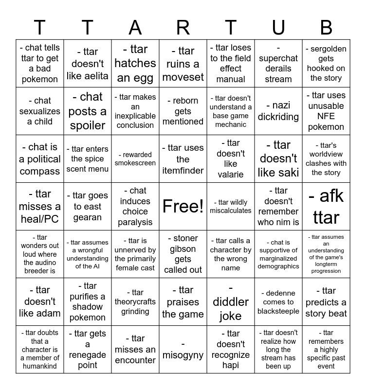 This bingo card has a free space and 48 words: - diddler joke, - nazi dickriding, - misogyny, - ttar goes to east gearan, - rewarded smokescreen, - afk ttar, - ttar doesn't like aelita, - ttar gets a renegade point, - superchat derails stream, - stoner gibson gets called out, - sergolden gets hooked on the story, - ttar ruins a moveset, - ttar doesn't like saki, - ttar doesn't like valarie, - ttar doesn't like adam, - ttar doesn't remember who nim is, - chat sexualizes a child, - ttar uses unusable NFE pokemon, - dedenne comes to blacksteeple, - ttar loses to the field effect manual, - ttar doesn't understand a base game mechanic, - chat induces choice paralysis, - chat tells ttar to get a bad pokemon, - chat posts a spoiler, - ttar predicts a story beat, - ttar makes an inexplicable conclusion, - ttar's worldview clashes with the story, - ttar doubts that a character is a member of humankind, - ttar uses the itemfinder, - ttar enters the spice scent menu, - ttar doesn't realize how long the stream has been up, - ttar wildly miscalculates, - ttar assumes an understanding of the game's longterm progression, - ttar purifies a shadow pokemon, - ttar misses a heal/PC, - ttar calls a character by the wrong name, - chat is supportive of marginalized demographics, - chat is a political compass, - ttar is unnerved by the primarily female cast, - ttar theorycrafts grinding, - ttar wonders out loud where the audino breeder is, - ttar remembers a highly specific past event, - ttar hatches an egg, - ttar misses an encounter, - reborn gets mentioned, - ttar praises the game, - ttar assumes a wrongful understanding of the AI and - ttar doesn't recognize hapi.