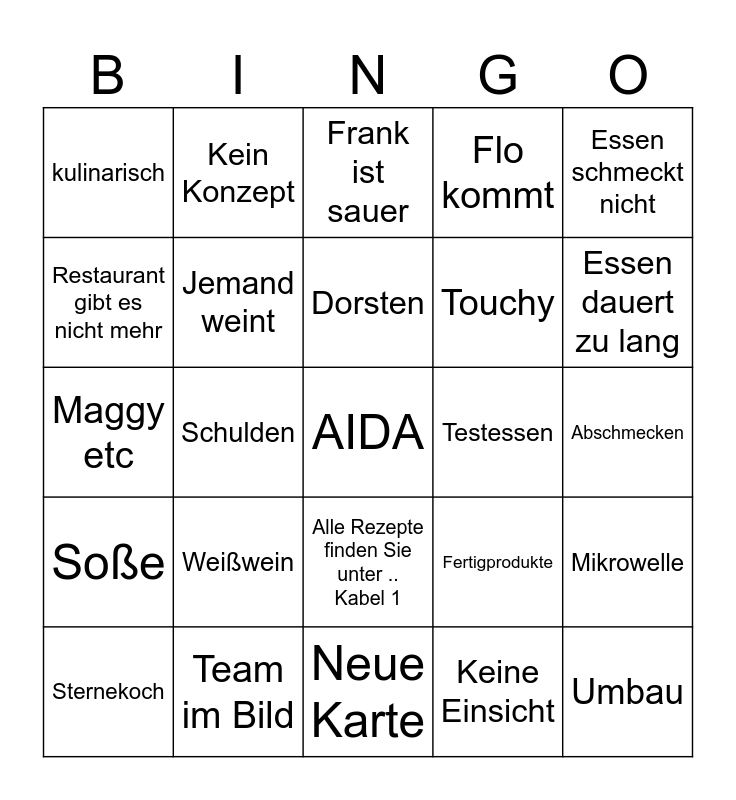 This bingo card has a free space and 24 words: Weißwein, Team im Bild, Dorsten, Sternekoch, Essen schmeckt nicht, kulinarisch, Restaurant gibt es nicht mehr, Kein Konzept, Testessen, Alle Rezepte finden Sie unter .. Kabel 1, Touchy, Maggy etc, Fertigprodukte, Mikrowelle, Jemand weint, Keine Einsicht, Abschmecken, Frank ist sauer, Essen dauert zu lang, Schulden, Umbau, Soße, Flo kommt and Neue Karte.