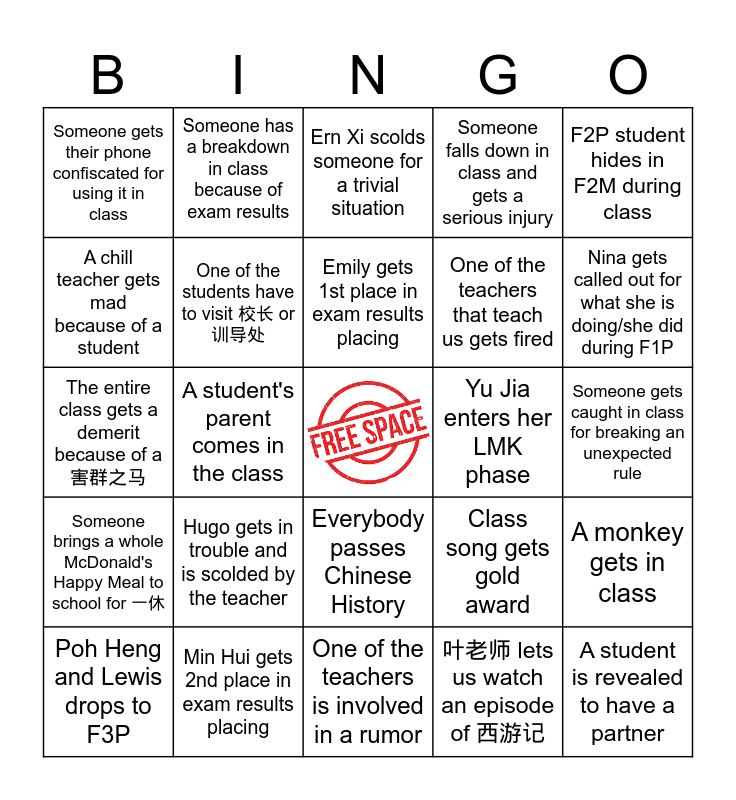 This bingo card has a free space and 24 words: Hugo gets in trouble and is scolded by the teacher, Min Hui gets 2nd place in exam results placing, Emily gets 1st place in exam results placing, Poh Heng and Lewis drops to F3P, F2P student hides in F2M during class, Someone gets their phone confiscated for using it in class, A chill teacher gets mad because of a student, Someone has a breakdown in class because of exam results, Yu Jia enters her LMK phase, Everybody passes Chinese History, One of the teachers that teach us gets fired, The entire class gets a demerit because of a 害群之马, Class song gets gold award, A monkey gets in class, One of the students have to visit 校长 or 训导处, 叶老师 lets us watch an episode of 西游记, Someone gets caught in class for breaking an unexpected rule, Ern Xi scolds someone for a trivial situation, Nina gets called out for what she is doing/she did during F1P, A student's parent comes in the class, A student is revealed to have a partner, Someone brings a whole McDonald's Happy Meal to school for 一休, Someone falls down in class and gets a serious injury and One of the teachers is involved in a rumor.