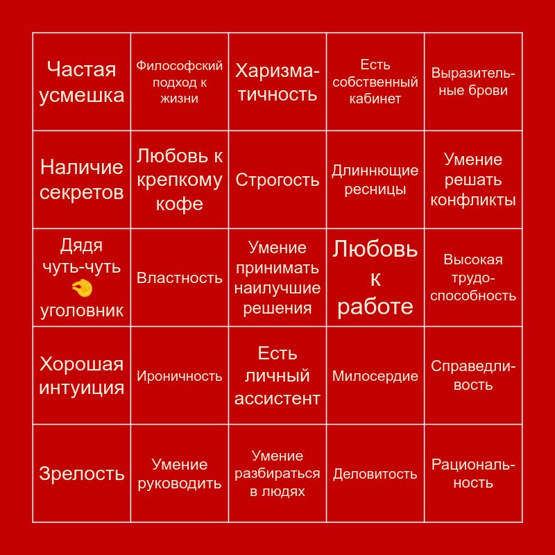 This bingo card has a free space and 24 words: Ироничность, Умение руководить, Строгость, Зрелость, Выразитель-ные брови, Частая усмешка, Наличие секретов, Философский подход к жизни, Любовь к работе, Есть личный ассистент, Длиннющие ресницы, Дядя чуть-чуть🤏 уголовник, Милосердие, Справедли-вость, Любовь к крепкому кофе, Деловитость, Высокая трудо-способность, Харизма-тичность, Умение решать конфликты, Властность, Рациональ-ность, Хорошая интуиция, Есть собственный кабинет and Умение разбираться в людях.