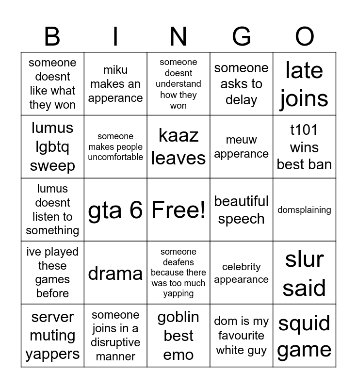 This bingo card has a free space and 24 words: drama, someone joins in a disruptive manner, kaaz leaves, server muting yappers, late joins, someone doesnt like what they won, lumus lgbtq sweep, miku makes an apperance, beautiful speech, someone deafens because there was too much yapping, meuw apperance, lumus doesnt listen to something, celebrity appearance, slur said, someone makes people uncomfortable, dom is my favourite white guy, domsplaining, someone doesnt understand how they won, t101 wins best ban, gta 6, squid game, ive played these games before, someone asks to delay and goblin best emo.