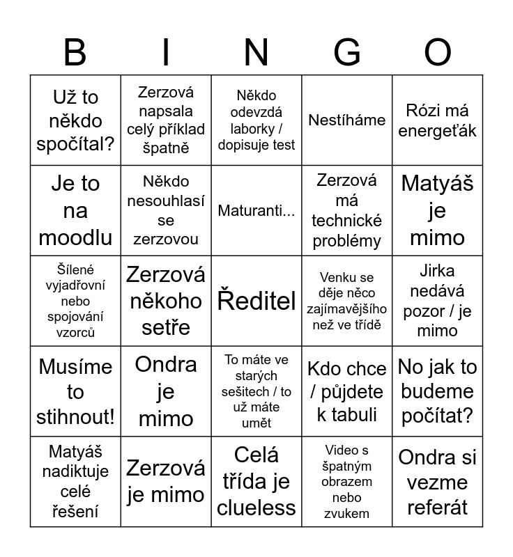 This bingo card has 25 words: Ondra je mimo, Celá třída je clueless, Maturanti..., Matyáš nadiktuje celé řešení, Rózi má energeťák, Už to někdo spočítal?, Je to na moodlu, Zerzová napsala celý příklad špatně, Venku se děje něco zajímavějšího než ve třídě, To máte ve starých sešitech / to už máte umět, Zerzová má technické problémy, Šílené vyjadřovní nebo spojování vzorců, Kdo chce / půjdete k tabuli, No jak to budeme počítat?, Někdo nesouhlasí se zerzovou, Ondra si vezme referát, Jirka nedává pozor / je mimo, Někdo odevzdá laborky / dopisuje test, Matyáš je mimo, Zerzová někoho setře, Ředitel, Zerzová je mimo, Musíme to stihnout!, Nestíháme and Video s špatným obrazem nebo zvukem.