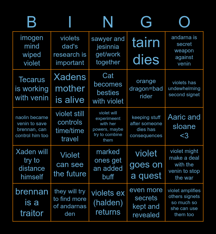 This bingo card has 25 words: Violet can see the future, violets ex (halden) returns, Cat becomes besties with violet, brennan is a traitor, andarna is secret weapon against venin, imogen mind wiped violet, Tecarus is working with venin, violets dad's research is important, keeping stuff after someone dies has consequences, marked ones get an added buff, orange dragon=bad rider, naolin became venin to save brennan, can control him too, violet goes on a quest, violet might make a deal with the venin to stop the war, Xadens mother is alive, violet amplifies others signets so much so she can use them too, Aaric and sloane <3, sawyer and jesinnia get/work together, violets has undewhelming second signet, violet still controls time/time travel, violet will experimeent with her powers, maybe try to combine them, they will try to find more of andarnas den, Xaden will try to distance himself, tairn dies and even more secrets kept and revealed.