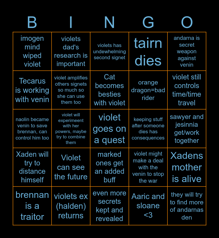 This bingo card has a free space and 24 words: Violet can see the future, violets ex (halden) returns, Cat becomes besties with violet, brennan is a traitor, andarna is secret weapon against venin, imogen mind wiped violet, Tecarus is working with venin, violets dad's research is important, keeping stuff after someone dies has consequences, marked ones get an added buff, orange dragon=bad rider, naolin became venin to save brennan, can control him too, violet might make a deal with the venin to stop the war, Xadens mother is alive, violet amplifies others signets so much so she can use them too, Aaric and sloane <3, sawyer and jesinnia get/work together, violets has undewhelming second signet, violet still controls time/time travel, violet will experimeent with her powers, maybe try to combine them, they will try to find more of andarnas den, Xaden will try to distance himself, tairn dies and even more secrets kept and revealed.