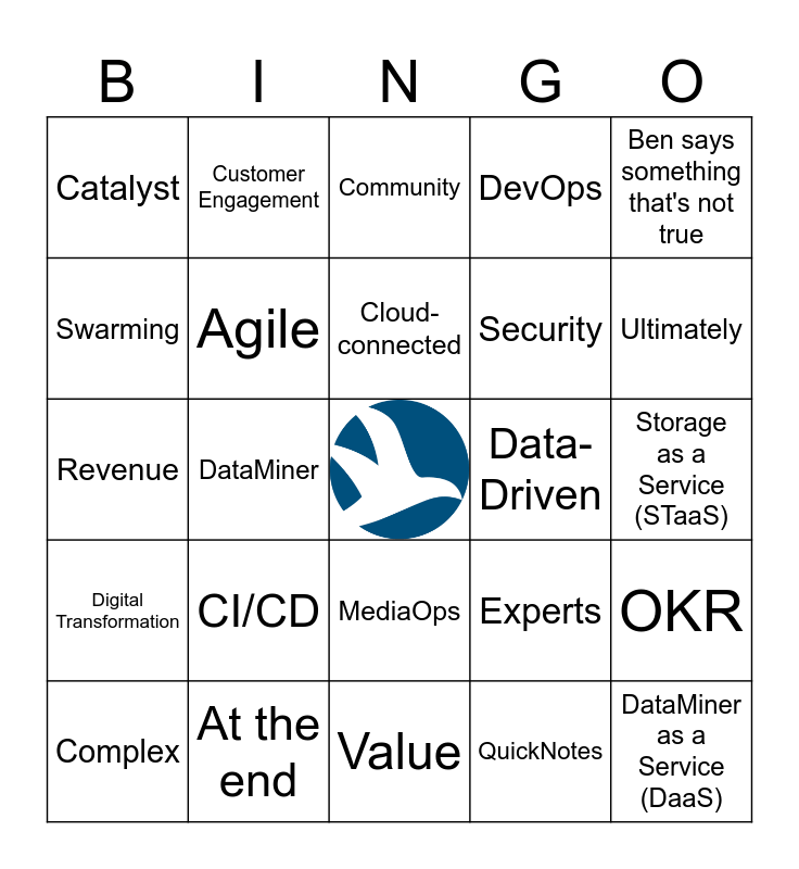 This bingo card has a free space and 38 words: Dojo, Orchestration, Collaboration, Agile, OKR, CI/CD, Cloud-connected, EMPOWER, Ben says something that's not true, Security, DataMiner, DevOps, DataMiner as a Service (DaaS), Storage as a Service (STaaS), Swarming, Digital Transformation, Click, click, click, Community, Solution, Data-Driven, Catalyst, At the end, Ultimately, Complex, Hey, Value, DiamonD, Product Owner, Catalog, Okay, Journey, MediaOps, QuickNotes, Customer Engagement, Experience, Experts, Revenue and Sales.