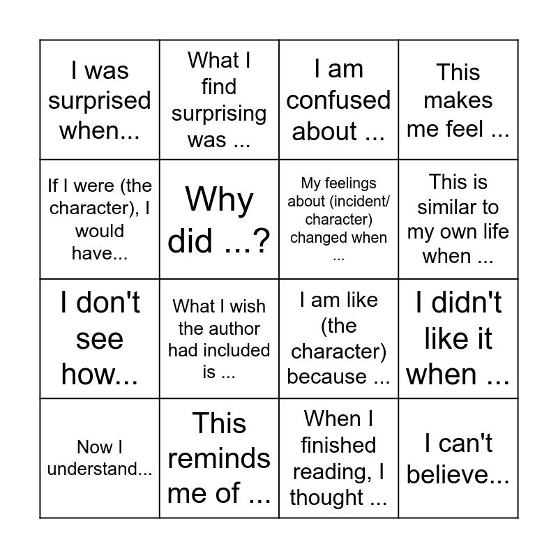 This bingo card has 16 words: This reminds me of ..., I didn't like it when ..., I am confused about ..., I was surprised when..., I don't see how..., What I find surprising was ..., I am like (the character) because ..., When I finished reading, I thought ..., If I were (the character), I would have..., Why did ...?, Now I understand..., This makes me feel ..., What I wish the author had included is ..., This is similar to my own life when ..., My feelings about (incident/ character) changed when ... and I can't believe....