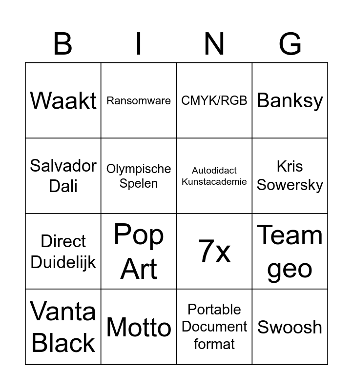 This bingo card has 16 words: Motto, Team geo, CMYK/RGB, Waakt, Direct Duidelijk, Ransomware, 7x, Portable Document format, Salvador Dali, Olympische Spelen, Vanta Black, Banksy, Pop Art, Kris Sowersky, Autodidact Kunstacademie and Swoosh.