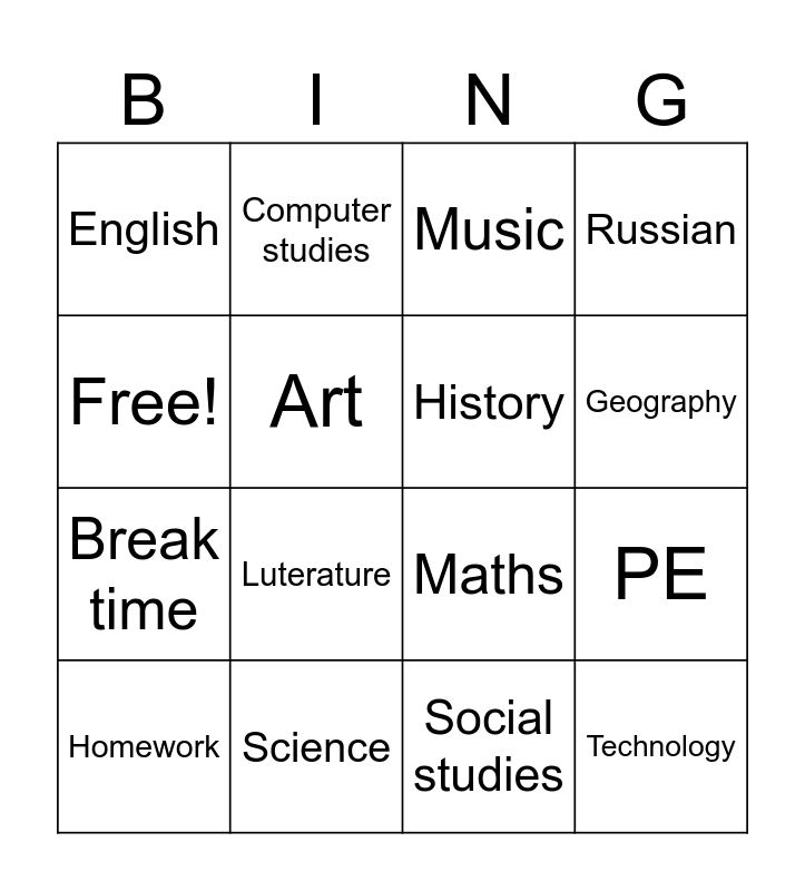 This bingo card has 16 words: Science, PE, Music, English, Break time, Computer studies, Maths, Social studies, Free!, Art, Homework, Russian, Luterature, Geography, History and Technology.