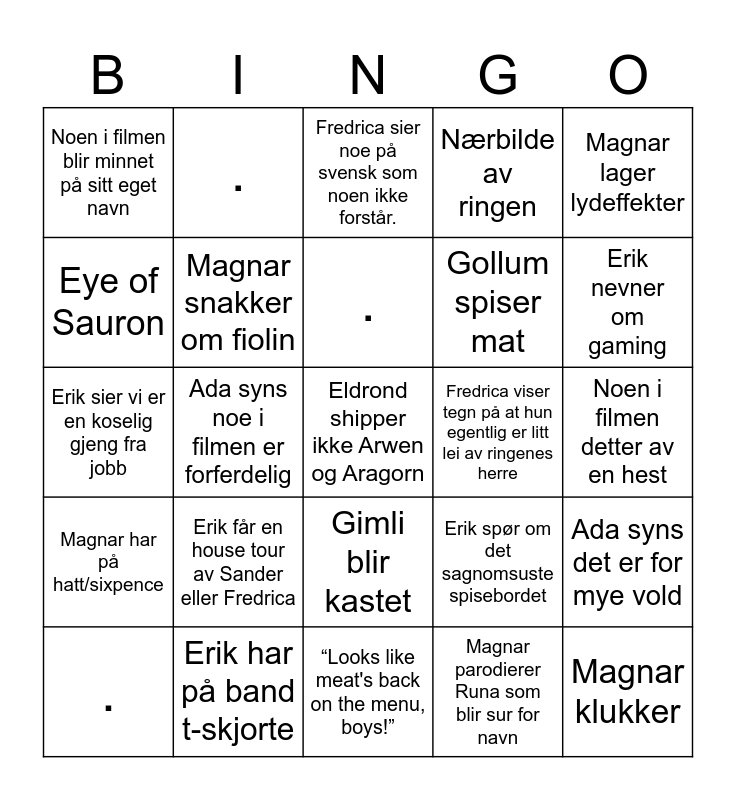 This bingo card has 34 words: Magnar klukker, Magnar parodierer Runa som blir sur for navn, Magnar sier “nom nom nom”, Magnar har på skinny jeans, Magnar har på hatt/sixpence, Magnar snakker om fiolin, Magnar lager lydeffekter, ., ., ., ., Fredrica sier noe på svensk som noen ikke forstår., Fredrica sitter på gulvet, Fredrica grøsser av Gollum, Fredrica viser tegn på at hun egentlig er litt lei av ringenes herre, Erik nevner om gaming, Erik har på band t-skjorte, Erik sier vi er en koselig gjeng fra jobb, Erik får en house tour av Sander eller Fredrica, Erik spør om det sagnomsuste spisebordet, Gimli blir kastet, Noen i filmen snakker om mat, Noen i filmen blir minnet på sitt eget navn, Noen i filmen detter av en hest, “Looks like meat's back on the menu, boys!”, Eldrond shipper ikke Arwen og Aragorn, Nærbilde av ringen, Frodo ser på ringen, Gollum spiser mat, Eye of Sauron, Ada syns Gollunm er ekkel, Ada syns noe i filmen er forferdelig, Ada syns det er for mye vold and Ada sier vi ikke trenger å sette på pause.
