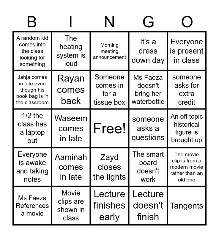 This bingo card has a free space and 29 words: Ms Faeza References a movie, Omar says 'wait', Waseem comes in late, Liyana is sleeping, A random kid comes into the class looking for something, Morning meeting announcement, Rayan comes back, Aaminah comes in late, someone asks a questions, Movie clips are shown in class, An off topic historical figure is brought up, Tangents, Lecture finishes early, Lecture doesn't finish, someone asks for extra credit, Amira is sleeping, Zayd closes the lights, Everyone is awake and taking notes, Everyone is present in class, 1/2 the class has a laptop out, The smart board doesn't work, The smart board works, Ms Faeza doesn't bring her waterbottle, Jahja comes in late even though his book bag is in the classroom, It's a dress down day, The heating system is loud, The movie clip is from a modern movie rather than an old one, Someone comes in for a tissue box and 9th graders walk in before the next period starts.