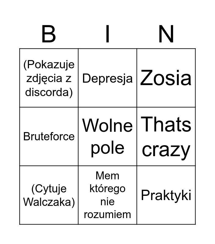This bingo card has a free space and 8 words: Thats crazy, Zosia, Depresja, (Cytuje Walczaka), (Pokazuje zdjęcia z discorda), Praktyki, Bruteforce and Mem którego nie rozumiem.
