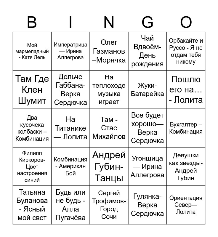 This bingo card has a free space and 24 words: Комбинация - Американ Бой, Будь или не будь - Алла Пугачёва, На теплоходе музыка играет, Татьяна Буланова - Ясный мой свет, Орбакайте и Руссо - Я не отдам тебя никому, Мой мармеладный - Катя Лель, Там Где Клен Шумит, Императрица — Ирина Аллегрова, Все будет хорошо— Верка Сердючка, Андрей Губин- Танцы, Жуки- Батарейка, Два кусочека колбаски – Комбинация, Угонщица — Ирина Аллегрова, Девушки как звезды- Андрей Губин, Дольче Габбана- Верка Сердючка, Гулянка- Верка Сердючка, Бухгалтер – Комбинация, Олег Газманов –Морячка, Пошлю его на… - Лолита, На Титанике — Лолита, Ориентация Север— Лолита, Филипп Киркоров- Цвет настроения синий, Чай Вдвоём- День рождения and Сергей Трофимов- Город Сочи.