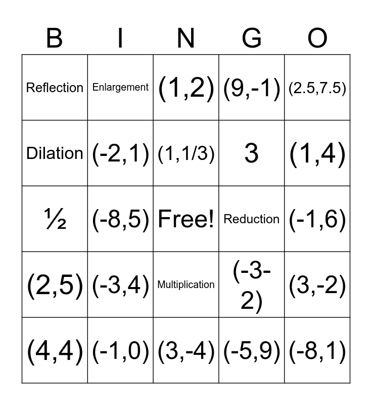 This bingo card has a free space and 25 words: (-3,4), (3,-4), (1,1/3), (4,4), (2.5,7.5), Reflection, Dilation, Enlargement, Reduction, Multiplication, 3, ½, (-3-2), (3,-2), (-2,1), (-5,-1), (-1,6), (1,2), (1,4), (-8,5), (-8,1), (-1,0), (2,5), (9,-1) and (-5,9).