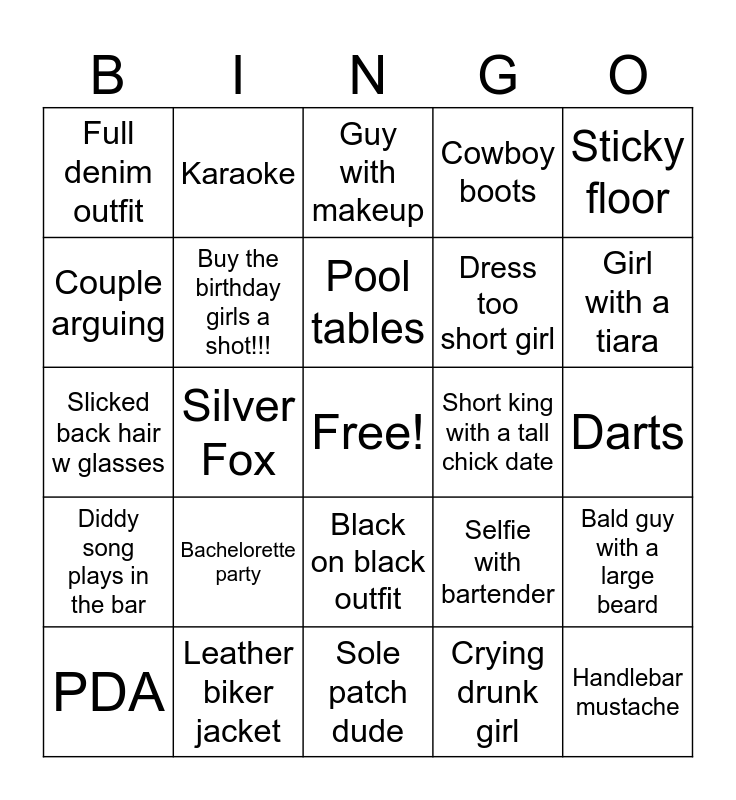 This bingo card has a free space and 24 words: Bachelorette party, Leather biker jacket, Pool tables, PDA, Sticky floor, Full denim outfit, Couple arguing, Karaoke, Short king with a tall chick date, Black on black outfit, Dress too short girl, Slicked back hair w glasses, Selfie with bartender, Bald guy with a large beard, Buy the birthday girls a shot!!!, Crying drunk girl, Darts, Guy with makeup, Girl with a tiara, Silver Fox, Handlebar mustache, Diddy song plays in the bar, Cowboy boots and Sole patch dude.
