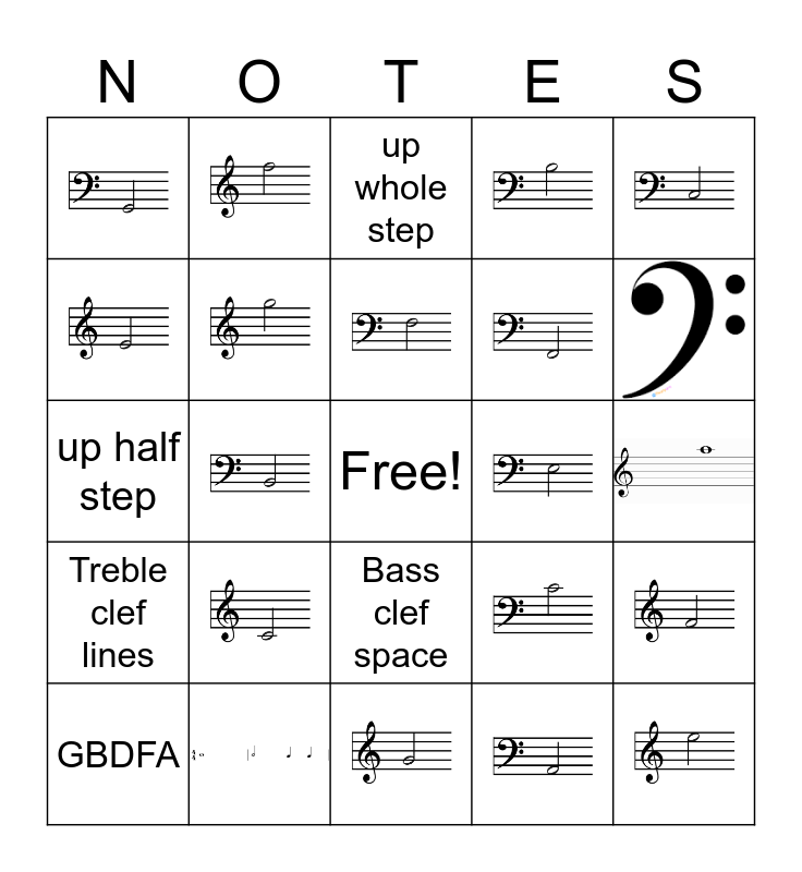 This bingo card has 40 images, a free space and 9 words: GBDFA, FACE, Bass clef space, Treble clef lines, lines added for notes above or below the staff, up half step, up whole step, down half step and down whole step.