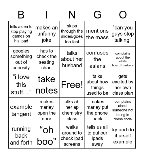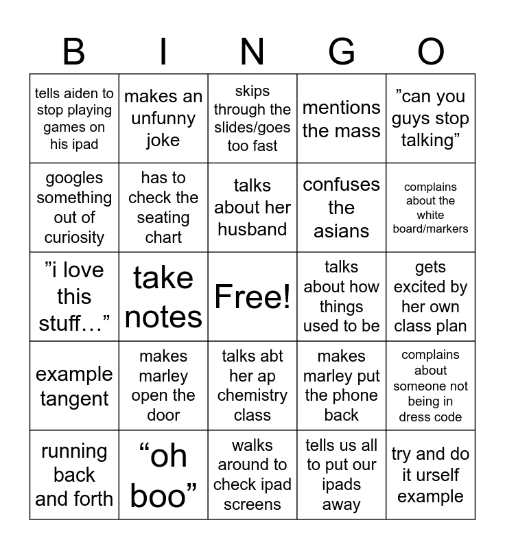 This bingo card has a free space and 24 words: makes marley open the door, “oh boo”, talks about her husband, running back and forth, ”can you guys stop talking”, tells aiden to stop playing games on his ipad, googles something out of curiosity, makes an unfunny joke, talks about how things used to be, talks abt her ap chemistry class, confuses the asians, ”i love this stuff…”, makes marley put the phone back, complains about someone not being in dress code, has to check the seating chart, tells us all to put our ipads away, gets excited by her own class plan, skips through the slides/goes too fast, complains about the white board/markers, take notes, try and do it urself example, example tangent, mentions the mass and walks around to check ipad screens.