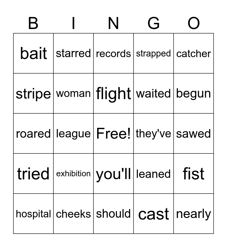 This bingo card has a free space and 24 words: exhibition, cheeks, flight, hospital, catcher, bait, stripe, starred, they've, you'll, waited, roared, leaned, fist, woman, cast, sawed, records, begun, league, nearly, tried, strapped and should.