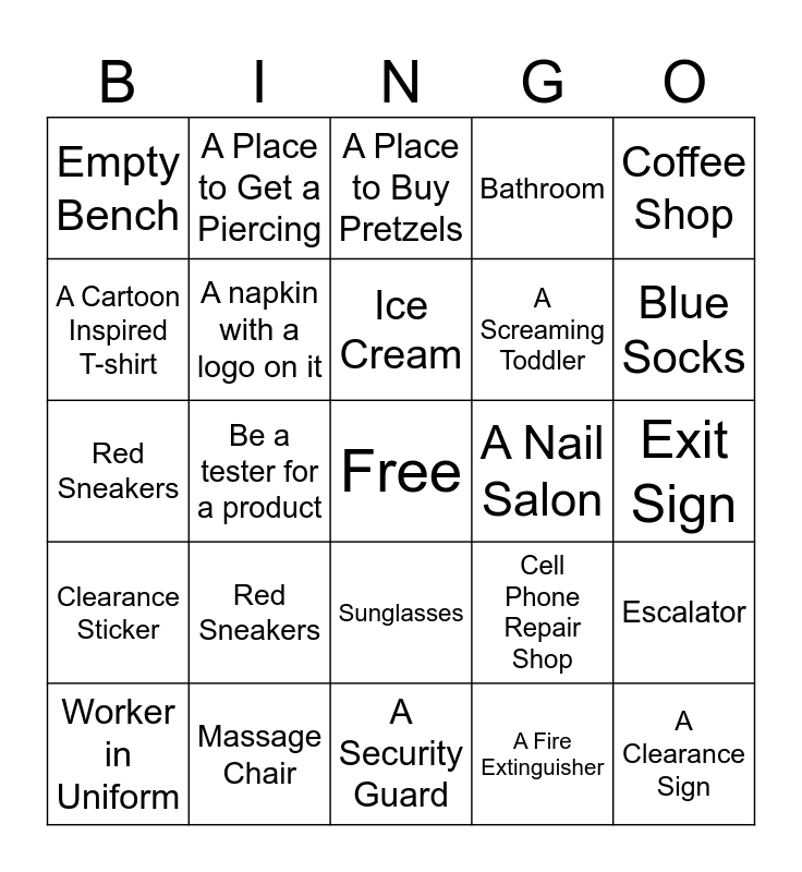 This bingo card has a free space and 49 words: Mall Walkers (Instead of Shoppers), A Clearance Sign, Vending Machine, A Security Guard, Red Sneakers, A Place to Buy Pretzels, A Place to Get a Piercing, Massage Chair, A Cartoon Inspired T-shirt, Something inside the mall that has wheels, A napkin with a logo on it, Bathroom, Escalator, Cell Phone Repair Shop, A Candy Store, People Watchers (Instead of Shoppers), Ice Cream, A Nail Salon, A Store that is Closed, Coffee Shop, Be a tester for a product, A Fire Extinguisher, Empty Bench, A Screaming Toddler, Fountain, Blue Socks, Worker in Uniform, Photo Booth, Sunglasses, Clearance Sticker, Candle, Lol dolls, A Store with the letter N, Mall Map, Massage Chair, Water Fountain, Free, Something on Sale, Exit Sign, Pair of Earings, Necklace, Mall Poster, Jacket, Watch, Red Sneakers, A Place to Buy Pretzels, A Hanger, Kid’s clothes and Something hoildays.