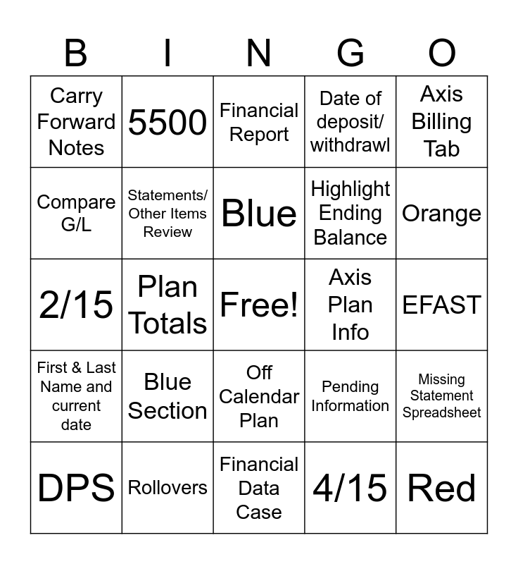 This bingo card has a free space and 24 words: Blue Section, Rollovers, Blue, DPS, Axis Billing Tab, Carry Forward Notes, Compare G/L, 5500, Axis Plan Info, Off Calendar Plan, Highlight Ending Balance, 2/15, Pending Information, Missing Statement Spreadsheet, Statements/ Other Items Review, 4/15, EFAST, Financial Report, Orange, Plan Totals, Red, First & Last Name and current date, Date of deposit/ withdrawl and Financial Data Case.