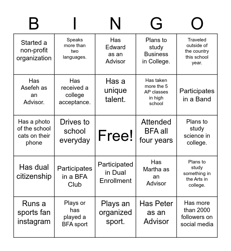 This bingo card has a free space and 29 words: Runs a sports fan instagram, Has more than three pets., Drives to school everyday, Enjoys Photography, Started a non-profit organization, Has Edward as an Advisor, Has received a college acceptance., Participates in a BFA Club, Attended BFA all four years, Plays or has played a BFA sport, Plans to study science in college., Has more than 2000 followers on social media, Plays an organized sport., Has Peter as an Advisor, Participates in a Band, Born in Atlanta, Georgia, Participated in Dual Enrollment, Has dual citizenship, Traveled outside of the country this school year., Has a photo of the school cats on their phone, Has Martha as an Advisor, Has Sarah as an Advisor, Has taken more the 5 AP classes in high school, Has Asefeh as an Advisor., Plans to study Business in College., Speaks more than two languages., Plans to study something in the Arts in college., Has a unique talent. and Loves the Beach..